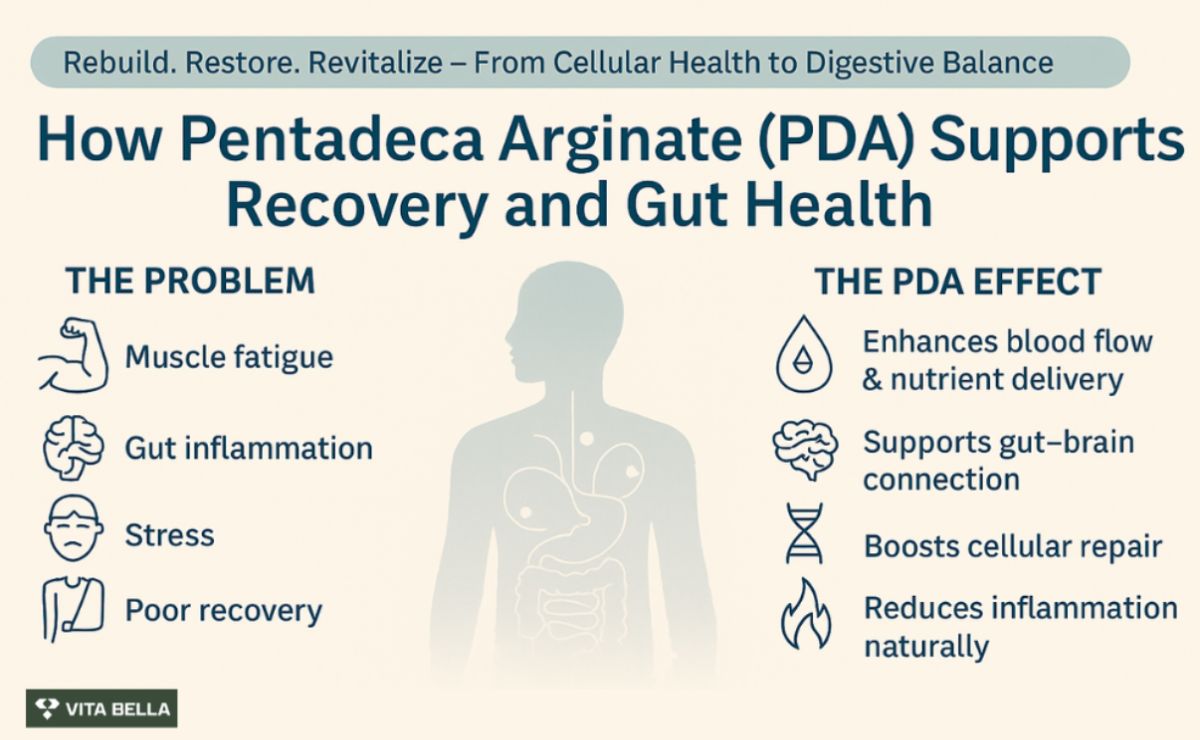 Vita Bella’s Pentadeca Arginate (PDA) helps reignite your system’s natural repair process, restoring energy, balance, and confidence from within. With consistent use, it supports deep cellular recovery and optimal gut health, helping you feel renewed, resilient, and ready to thrive.