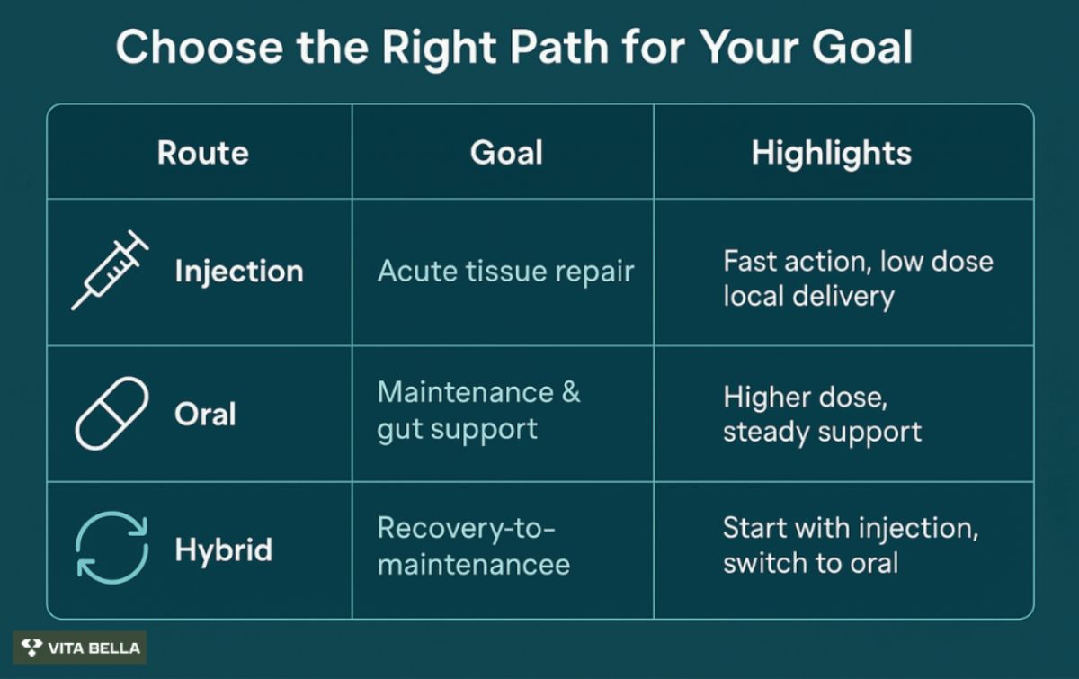 Goal: Long-term maintenance (joint health, gut barrier support). Choose the oral route for higher doses or enhanced formulation, and more convenience.