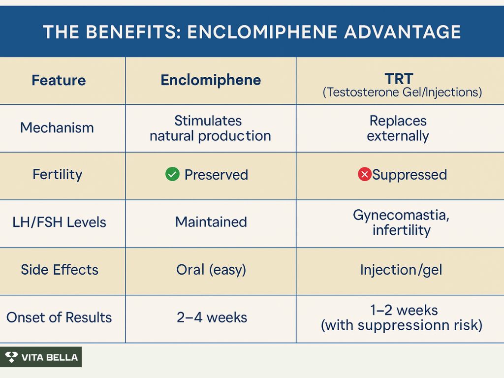 Unlike testosterone replacement therapy (TRT), which suppresses LH and FSH and reduces sperm production, enclomiphene maintains or improves spermatogenesis. In that Phase II trial 1, semen counts remained stable despite testosterone increases.