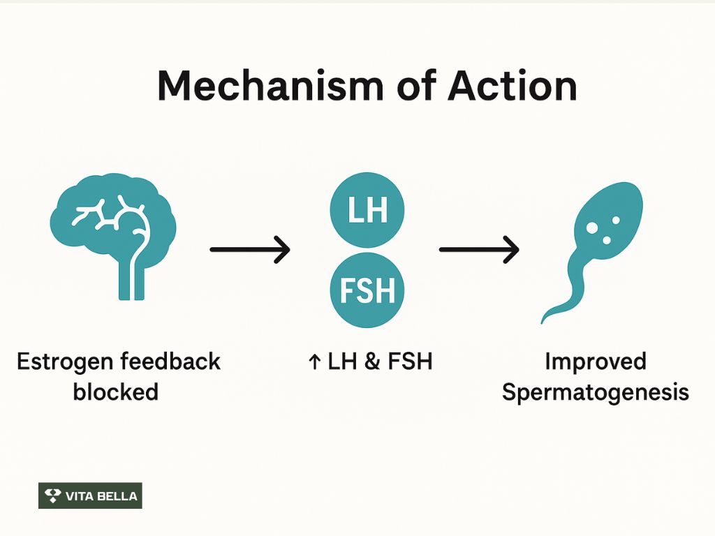 Clomiphene 1 acts by blocking estrogen’s negative feedback at the hypothalamus and pituitary, which in turn stimulates increased release of luteinizing hormone (LH) and follicle-stimulating hormone (FSH). That hormonal shift encourages the testes to increase endogenous testosterone production and support spermatogenesis.