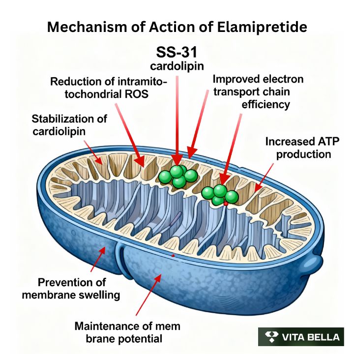 Elamipretide is a mitochondria-targeted tetrapeptide that binds to cardiolipin in the inner mitochondrial membrane. It stabilizes mitochondrial structure, reduces reactive oxygen species (ROS), and improves electron transport efficiency, boosting ATP production and cellular energy.