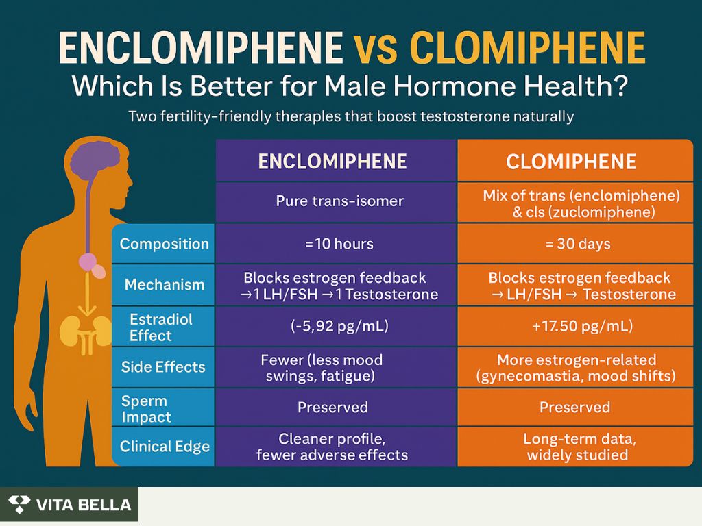 Low testosterone can affect energy, mood, and fertility, but not all treatments are created equal. At Vita Bella, we believe in science-backed, fertility-friendly solutions that help men naturally restore balance. Both enclomiphene and clomiphene are transforming hormone health by boosting testosterone without compromising fertility.