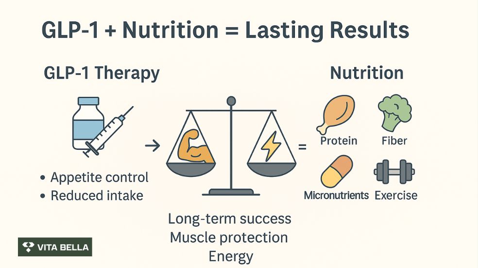 Nutrition ensures that weight loss from GLP-1 therapy is healthy and sustainable. It helps prevent muscle loss, nutrient deficiencies, and rebound weight gain, while also improving tolerance to treatment.