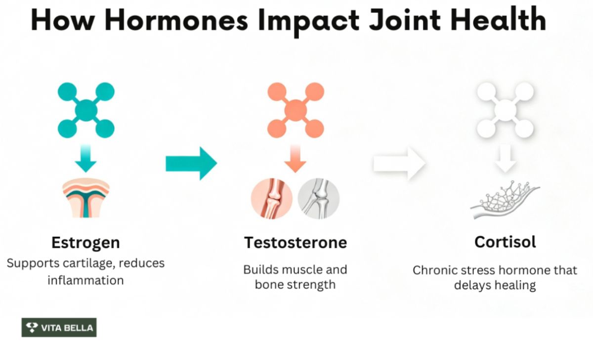 Are you tired of living with constant joint pain that limits your energy, mood, and mobility? At Vita Bella, we believe true healing starts from within by restoring balance to your body’s natural hormones. Discover how optimizing estrogen, testosterone, and cortisol can transform your joint health, reduce pain, and renew your energy. Keep reading to learn the science-backed connection between hormone balance and pain-free living and how you can start your journey to stronger, healthier joints today.