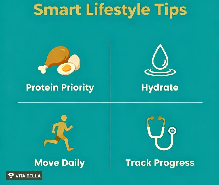 Protein intake (~1.0–1.2 g/kg body weight): preserves lean mass while promoting fat loss.