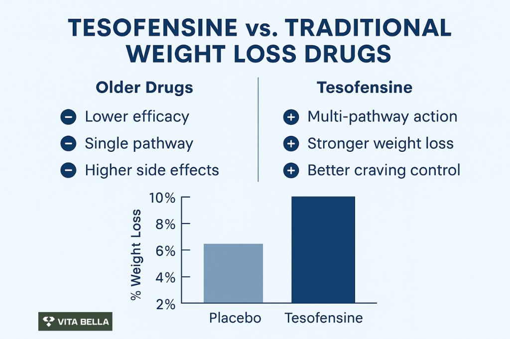 If losing weight feels like a constant battle, you’re not alone. Cravings and slow results sabotage countless journeys. Unlike traditional drugs, tesofensine works on multiple brain pathways for superior control. With our holistic approach, you’ll not only lose weight you’ll keep it off and regain confidence. Vita Bella offers many weight loss therapies like semaglutide, tirzepatide, and more.
