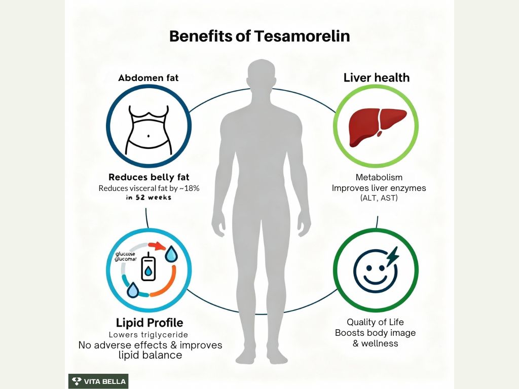 Clinical trials2 confirm that Tesamorelin reduces abdominal VAT and improves lipid metabolism without major changes in subcutaneous fat distribution. Thus, its mechanism directly addresses metabolic risk by altering fat metabolism through the GH-IGF-1 axis.