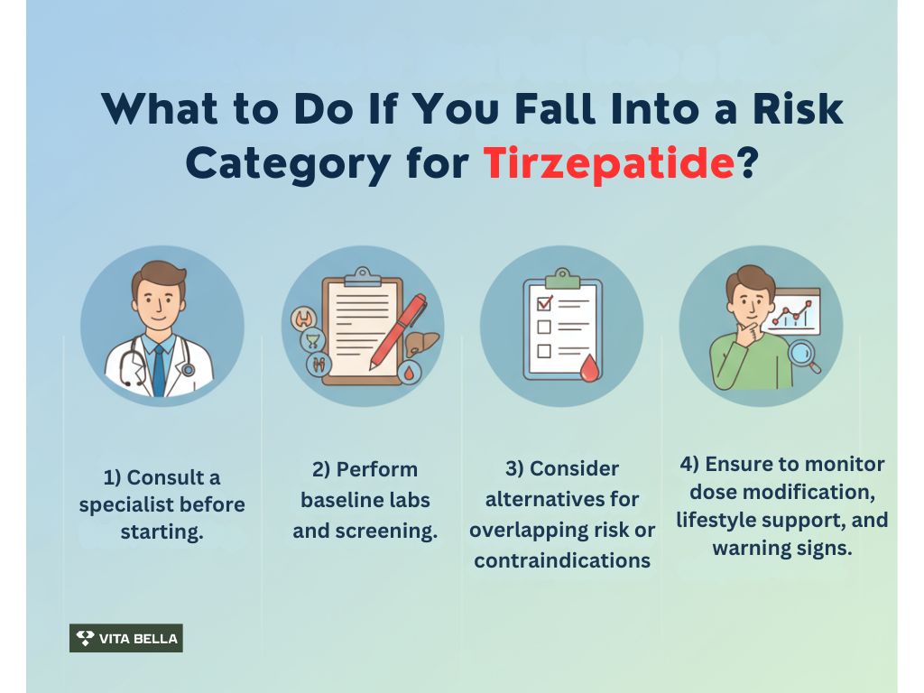 Tirzepatide offers transformative benefits, but it isn’t right for everyone. At Vita Bella, our mission is to guide you toward informed, doctor-supported wellness decisions. Explore essential safety notes, understand your risk factors, and take confident steps toward a healthier, more balanced future.