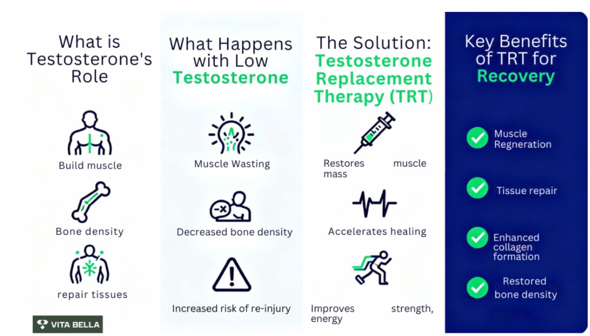 Decreased Bone Density: Testosterone is involved in maintaining bone density. During recovery from an injury, strong bones are essential for supporting muscle repair. Low testosterone can slow bone healing, making fractures take longer to mend and increasing the likelihood of future bone injuries.